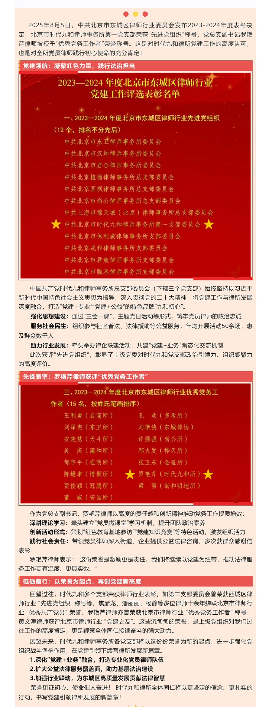党建引领促发展 荣誉砥砺谱新篇|时代九和律师事务所第一党支部及罗艳芹律师荣获律师行业党委表彰