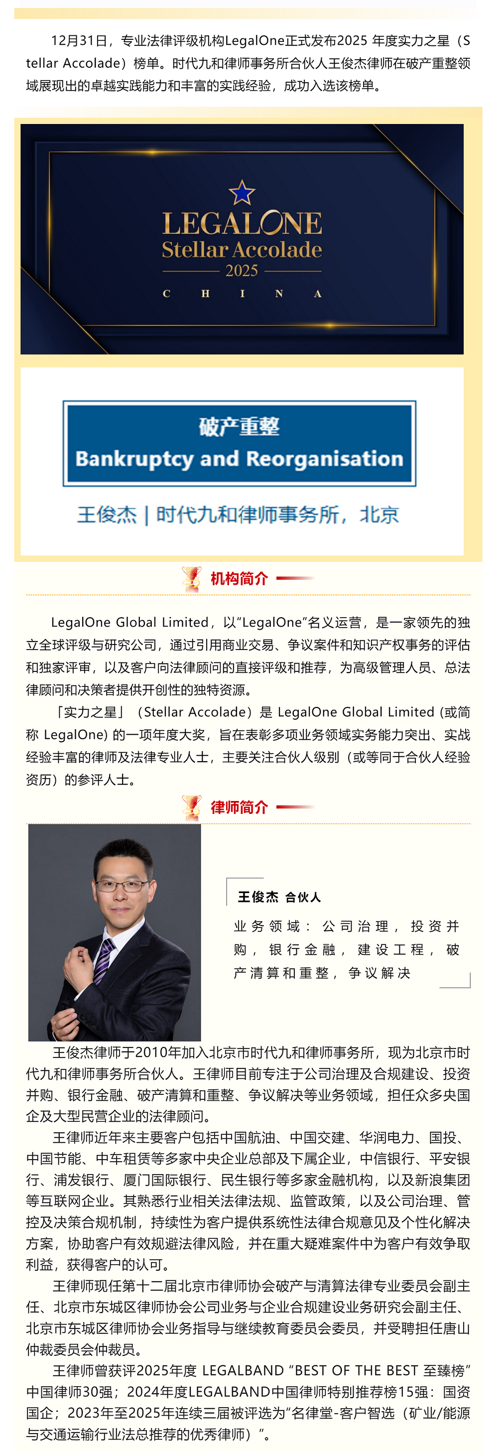 荣誉 | 时代九和合伙人王俊杰律师荣获LegalOne 破产重整领域2025 年度实力之星(Stellar Accolade)