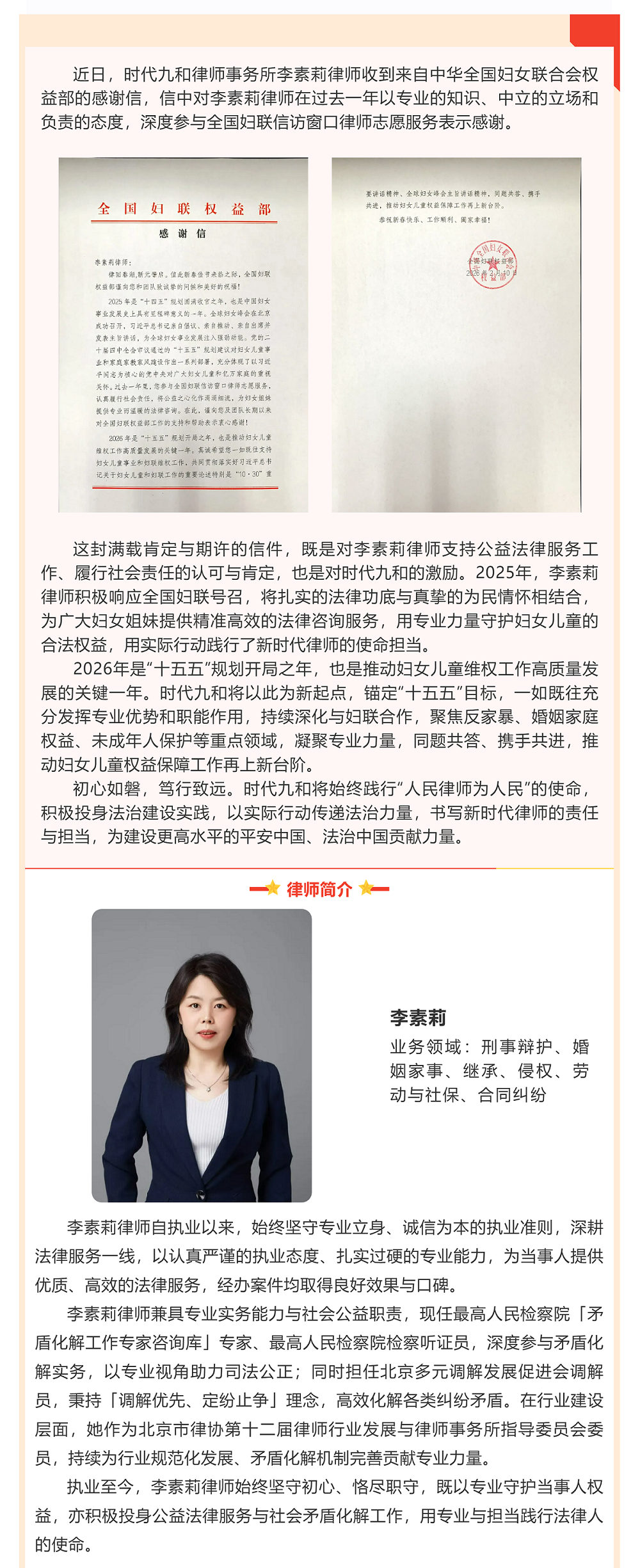 以法护权益 _ 时代九和李素莉律师获全国妇联感谢信